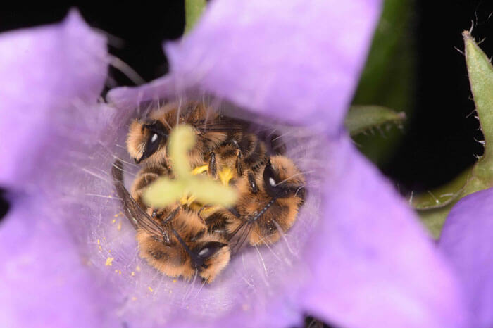 Für die fleißigen Insekten sind Ruhephasen und ein gesunder Schlaf genauso überlebenswichtig wie für uns Menschen. Die Schlafgewohnheiten der Wildbienen sind je nach Art sehr unterschiedlich, viele von ihnen schlafen jedoch eher nachts oder bei schlechtem Wetter, manche schlafen oder ruhen bis zu 10 Stunden. Doch sie können sich nicht ins Bett legen und einfach abschalten. Das Leben in freier Wildbahn erfordert von ihnen raffinierte Schlafgewohnheiten. Einige von Ihnen ruhen im Nest und bewachen ihre Pollen- und Nektarvorräte im Schlaf. Andere klammern sich mit ihren Beinen oder verbeißen sich mit ihren Mundwerkzeugen in Pflanzenteile und schlafen „hängend“. Und dann gibt noch die Blütenschläfer, die in den Blütenkelchen schlafen. Häufig findet man dort nicht nur einzelne Bienen, sondern mehrere, die eng aneinander mit ihren Artgenossen kuscheln.
