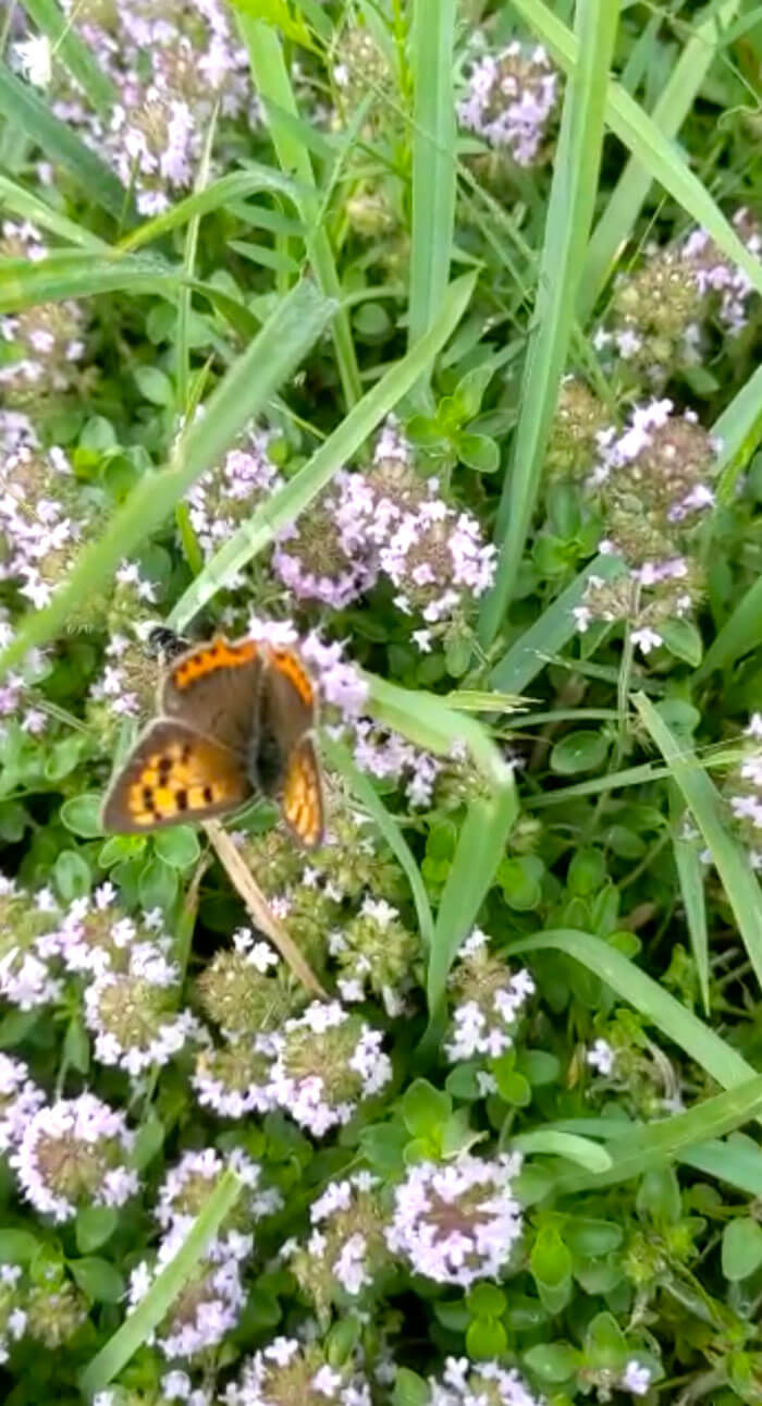 Als wir das Treiben im wildwachsenden Thymian genauer beobachtet haben, konnten wir sogar den Kleinen Feuerfalter (Lycaena phlaeas) fliegen sehen, der in Europa zwar noch oft vorkommt, jedoch in der Flachgauer Region immer seltener anzutreffen ist. Seine Flügeloberseiten sind orangerot dunkelbraun gefärbt. Nahe dem Rand sind mehrere dunkle Würfelflecken auf den Vorderflügeln erkennbar. Er bewohnt verschiedenste Lebensräume, vor allem aber locker bewachsene und offenere Landschaften, wie beispielsweise Sandgruben, andere sandige Gebiete oder Wegränder. Die Raupe des tagaktiven Schmetterlings ist ein wichtiger Nützling, denn die wichtigsten Nahrungspflanzen für die Raupen des Kleinen Feuerfalters sind verschiedene Ampfer-Arten. „Wir freuen uns, dass Tier, Mensch und Natur gleichermaßen durch unsere naturnahe Heubewirtschaftung profitieren“, verrät uns Christine.