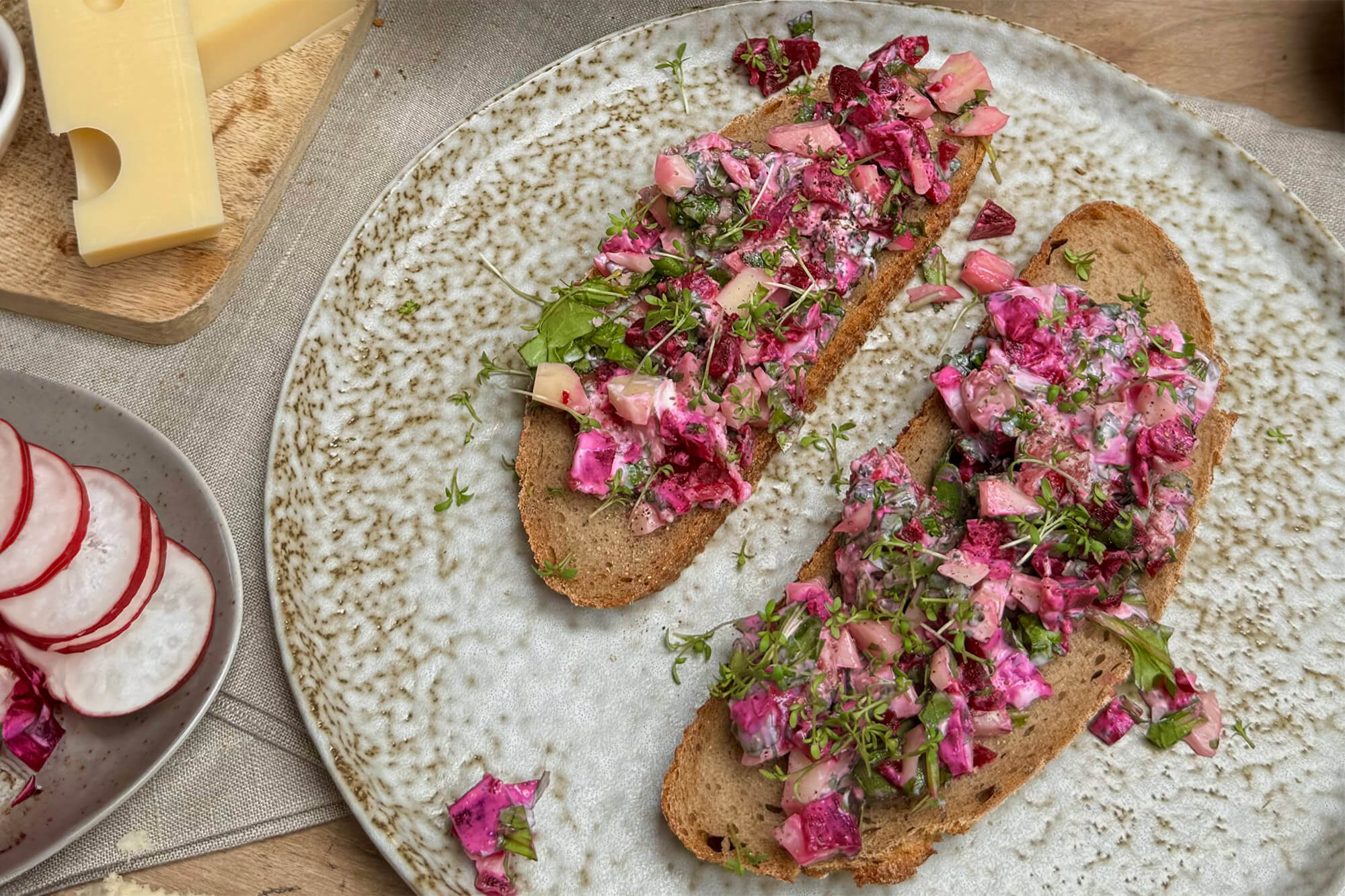 Rucola, Bauernspeck, Rote-Beete-Scheiben, Radieschen-Scheiben, Kren und die Emmentaler Scheiben aufeinander auf ein Holzbrett legen. Mit einem scharfen, großen Messer die Zutaten gleichmäßig zerkleinern, bis eine gleichmäßige Masse entsteht. Je feiner, desto besser.