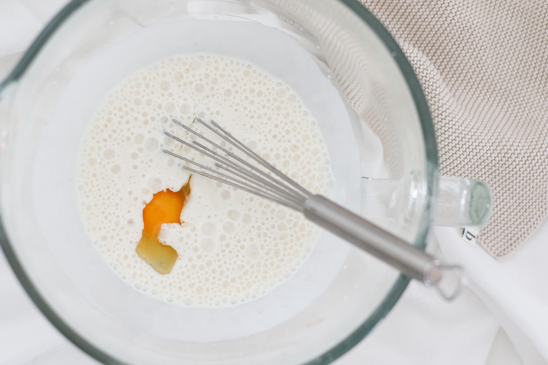 Die Buttermilch in eine Schüssel geben, Germ hineinbröckeln und glattrühren. Das Ei unterschlagen.
