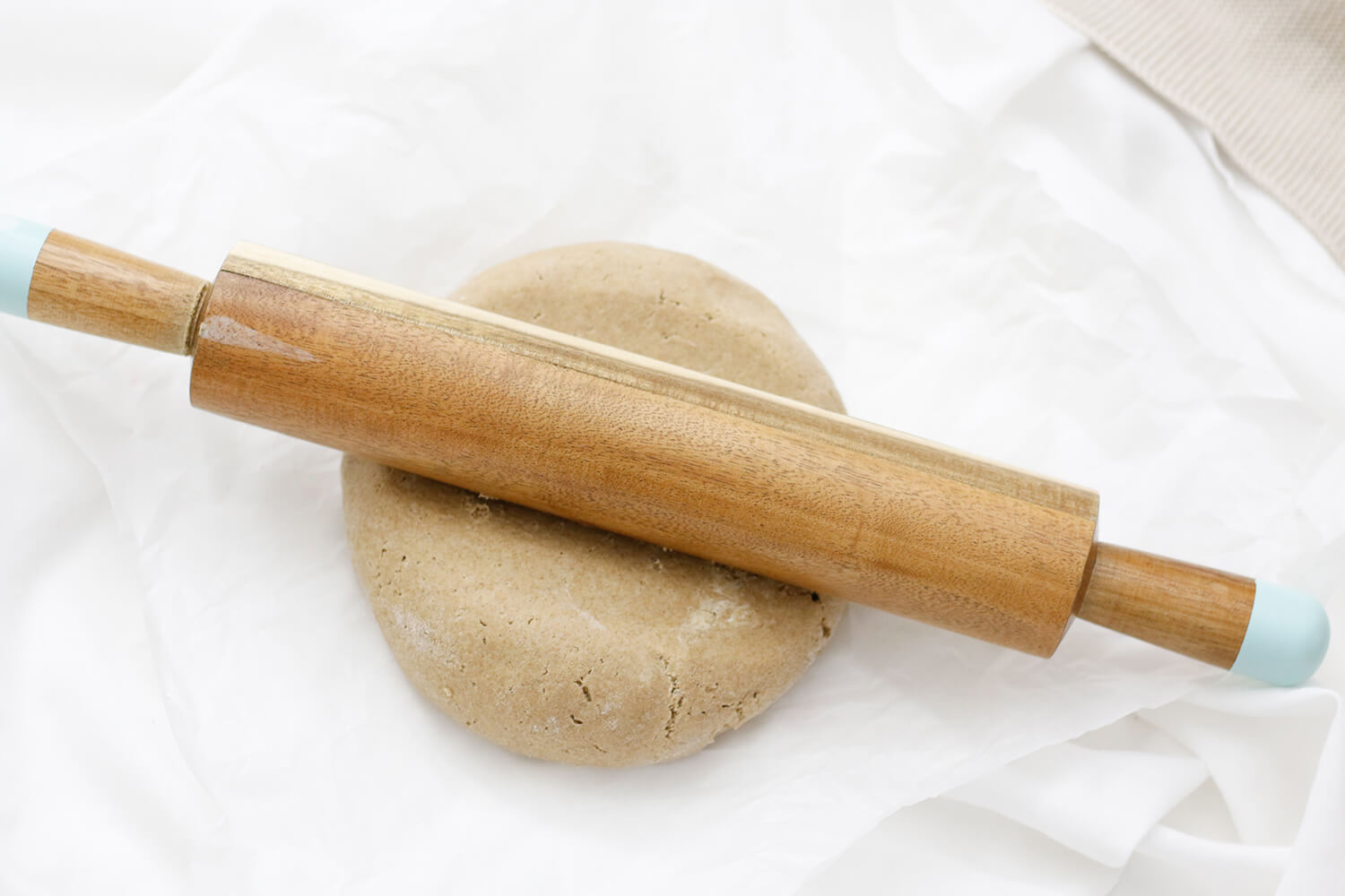 Ein Backblech mit Backpapier auslegen. Ofen auf 200°C Heißluft vorheizen. Den gegangenen Teig auf eine bemehlte Arbeitsfläche stürzen und rund ausrollen.