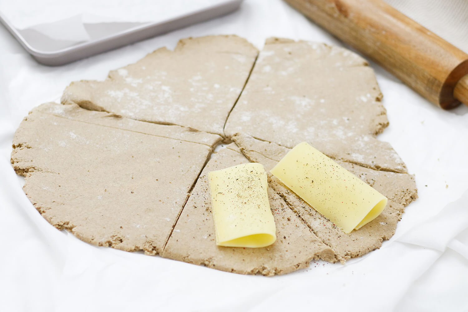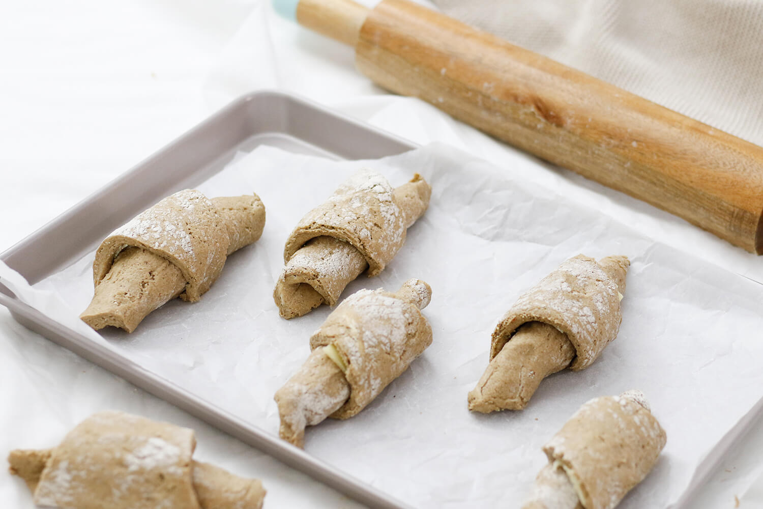 In Tortenstücke schneiden und jedes Stück mit einer Scheibe Bergkäse belegen. Die Stücke von der langen Seite aufrollen und auf das Blech legen. Die Croissants nochmal 15-20 Minuten gehen lassen.