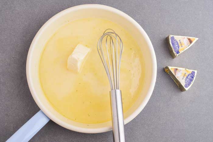 Den Bratensatz mit Weißwein und Gemüsefond ablöschen und aufkochen lassen. Käseecken unterrühren und schmelzen lassen. Die Sauce ein wenig einkochen.