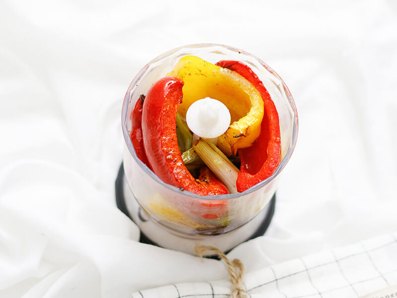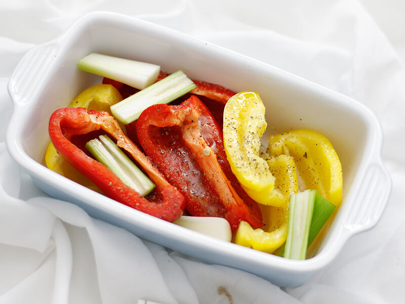 Für den Dip Paprika vierteln, Frühlingszwiebel in grobe Stücke schneiden. In eine Ofenform geben mit Olivenöl, Salz und Chiliflocken vermengen. Knoblauchzehe (mit Schale) zugeben und im Ofen bei 180°C Heißluft 30-35 Minuten rösten.