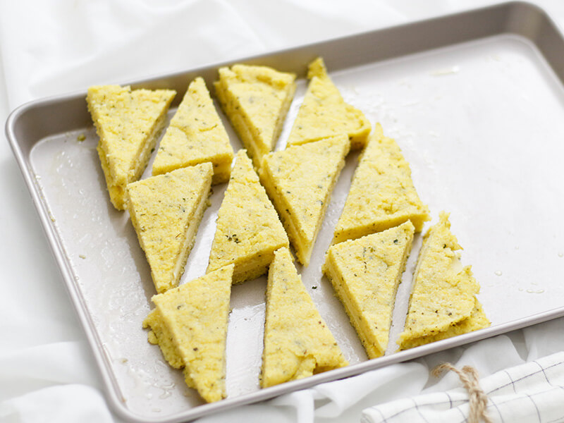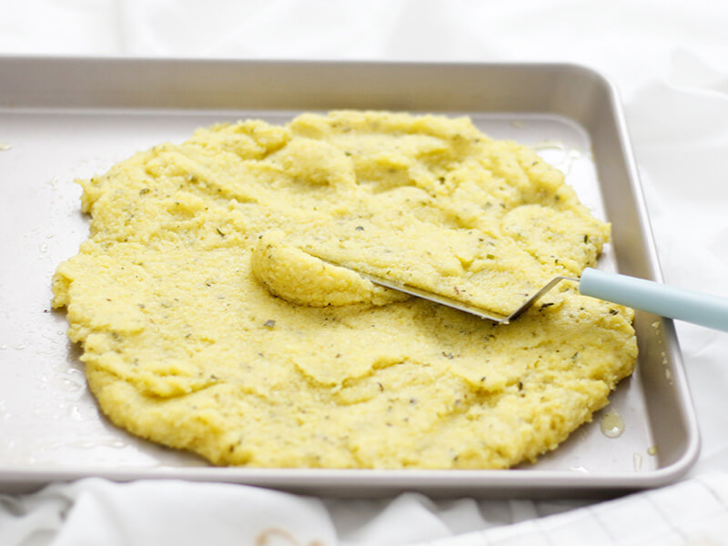 Ein kleines Blech ganz leicht mit etwas Olivenöl bestreichen. Den Polentabrei ca. 2 cm glatt aufstreichen. Polenta komplett auskühlen und fest werden lassen.