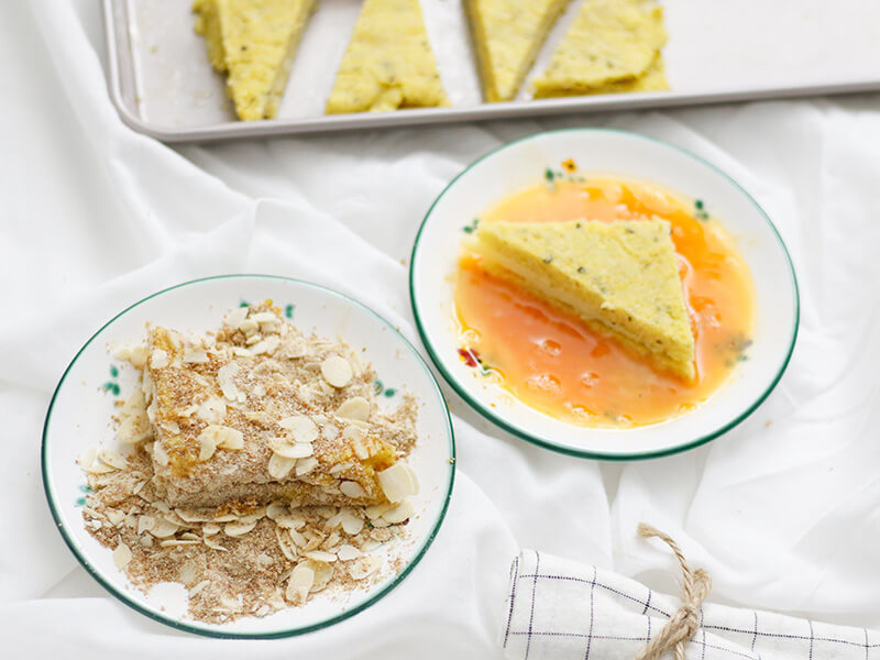 Die Polentaecken zuerst in dem Ei wenden dann in der Bröselmischung, dabei wirklich gründlich sein und jede Seite gut und fest panieren.