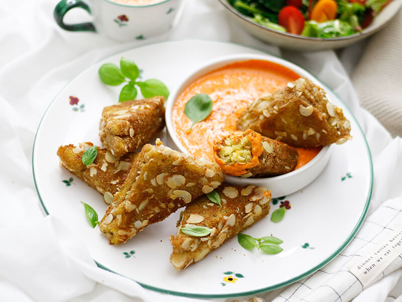 Gebackene Polenta Bergkäse Ecken mit Paprika Dip