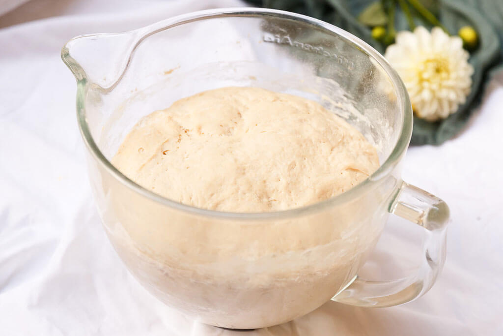 Aus dem Teig eine Kugel formen und 45 Minuten zugedeckt gehen lassen, bis sein Volumen sich verdoppelt hat.