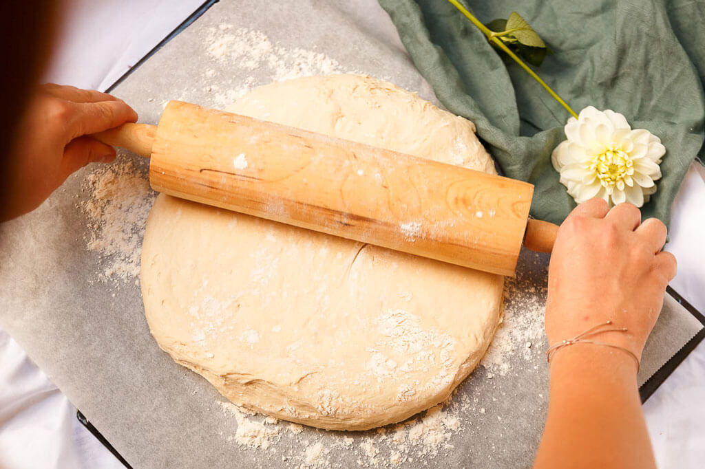 Den Teig auf einer bemehlten Arbeitsfläche mit der Hand noch einmal kurz kneten (Der Teig ist eher weich, aber das passt so.).