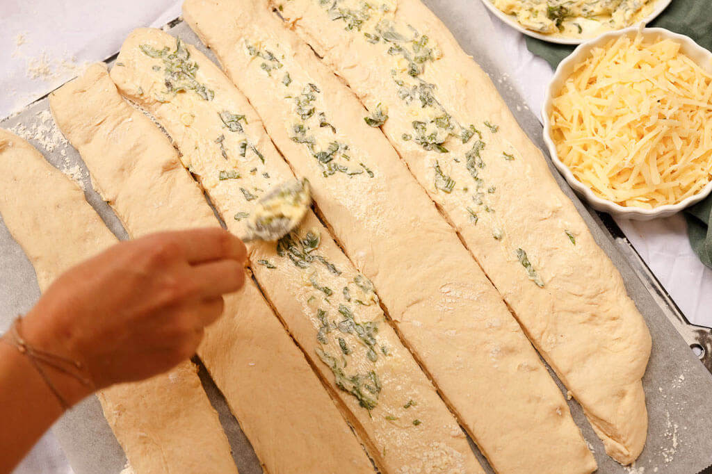Mit Kräuterbutter bestreichen (der Teig muss ganz bedeckt sein) und mit Käse bestreuen. Der Länge nach in 6–8 Streifen schneiden. Die Streifen übereinanderlegen (am besten mit einer Palette – die Kräuterbutter-Seite ist immer oben).