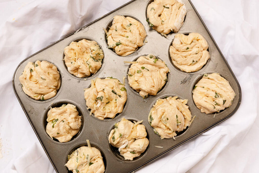 Das Ganze in 15–20 Teile schneiden und mit der Schnittfläche nach oben in die Muffinmulden geben.