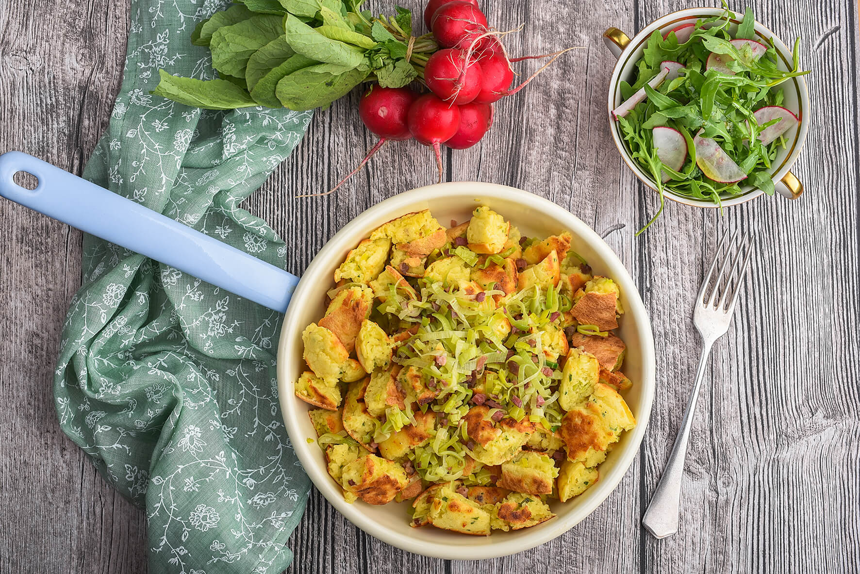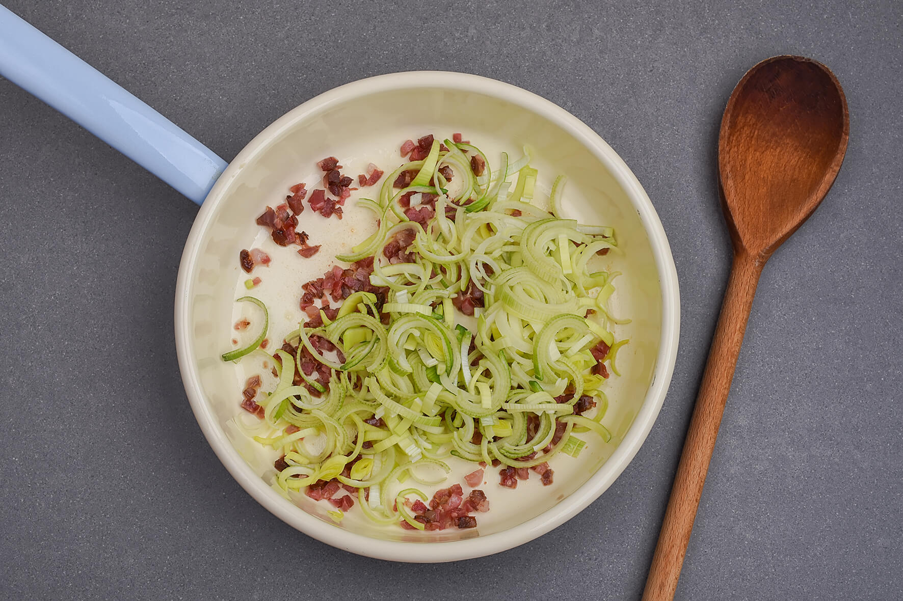 Lauch in Halbringe schneiden. In einer Pfanne Speck ohne Öl anbraten, Lauch hinzugeben und ebenfalls kurz anrösten.