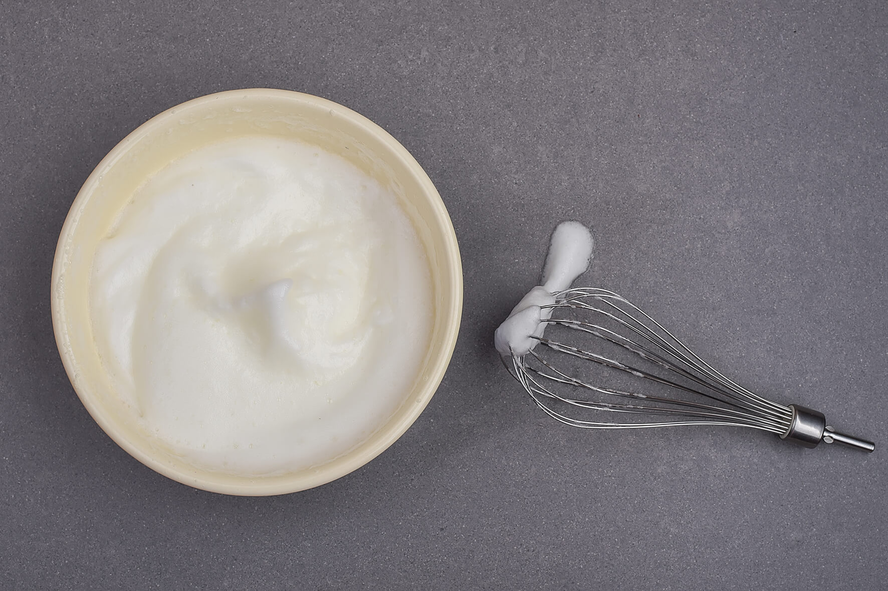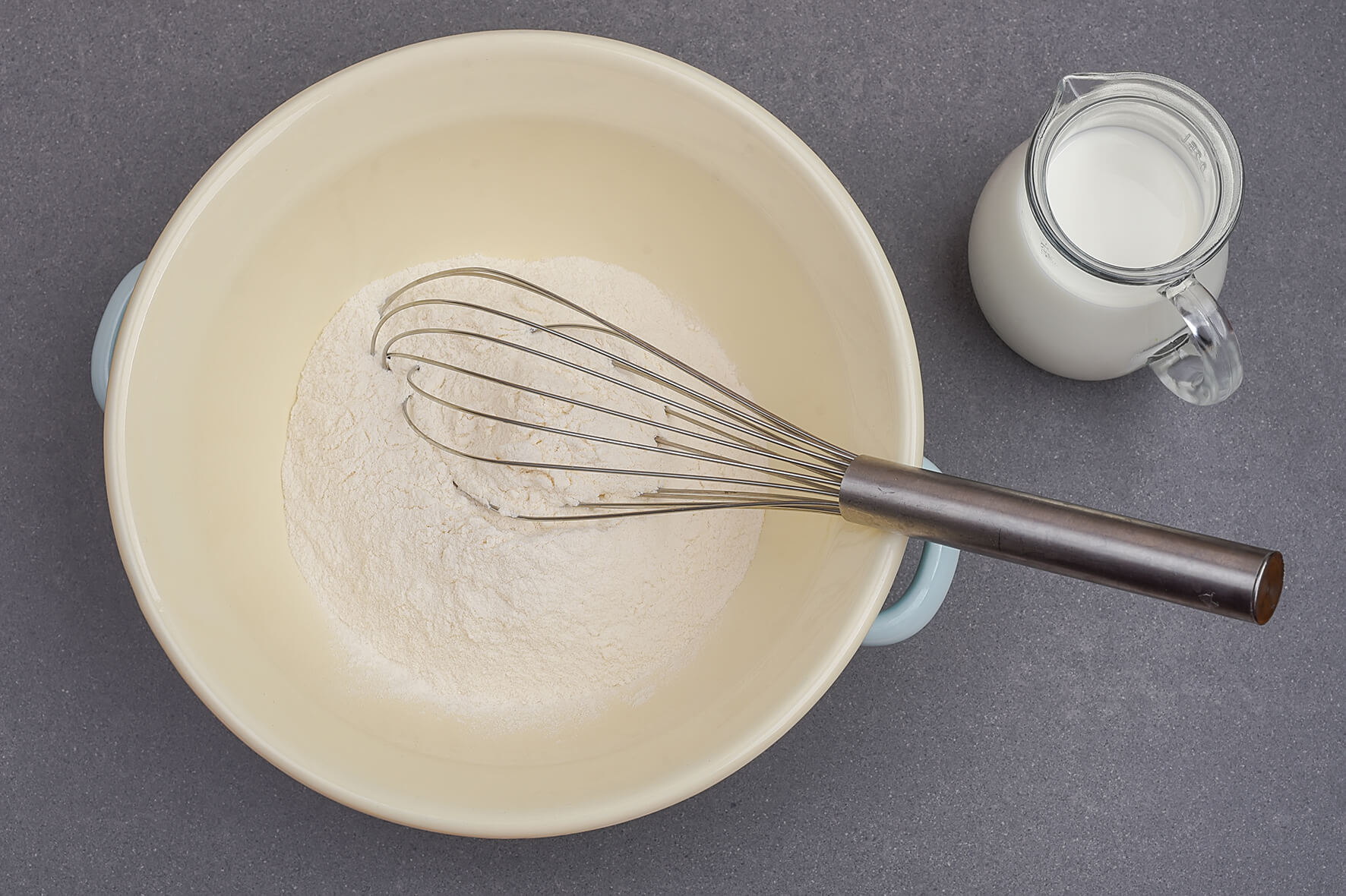 Wenn notwendig, etwas Butter dazugeben. Mehl in eine Schüssel geben, Milch nach und nach dazugießen und gut vermischen.