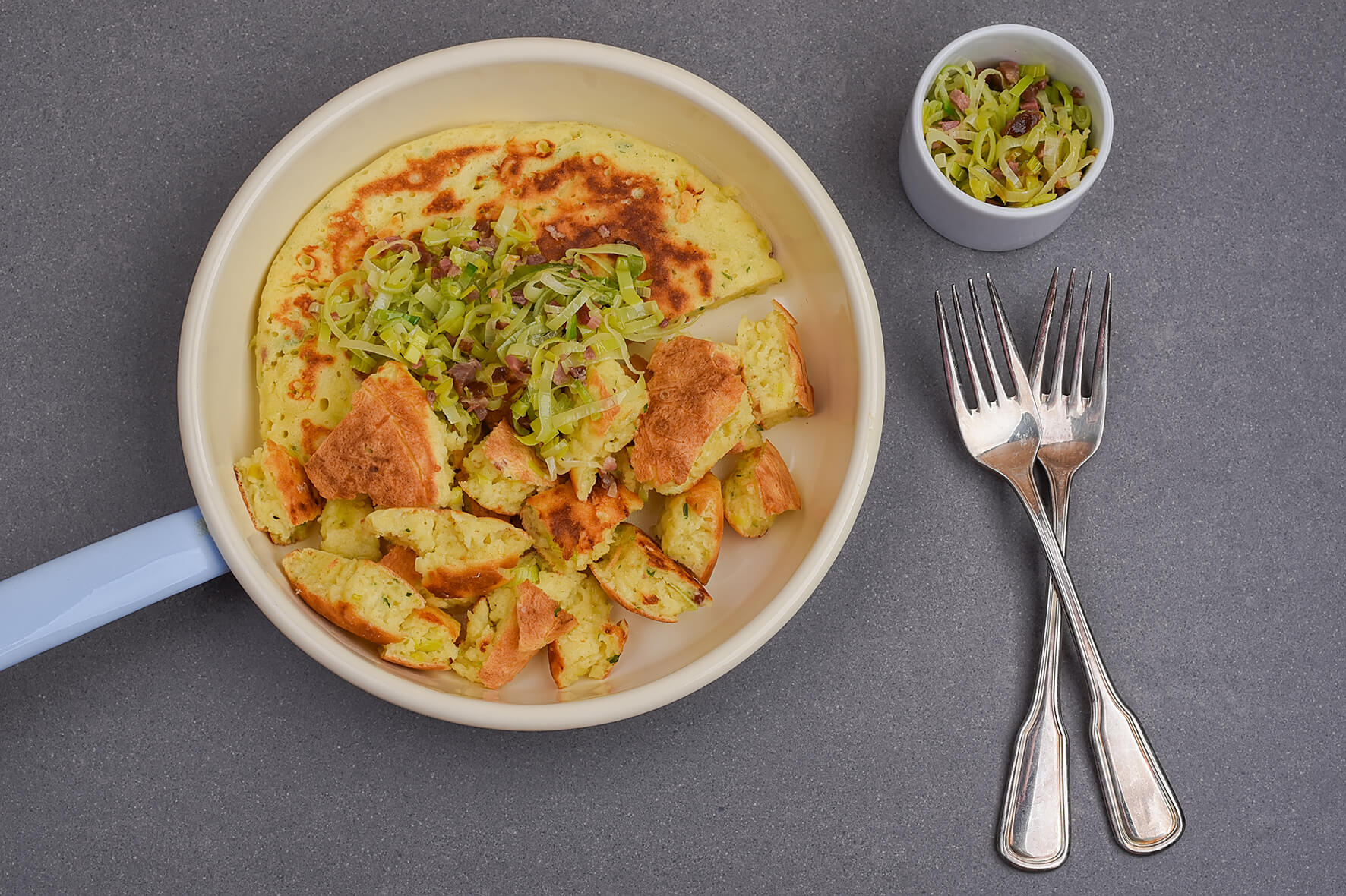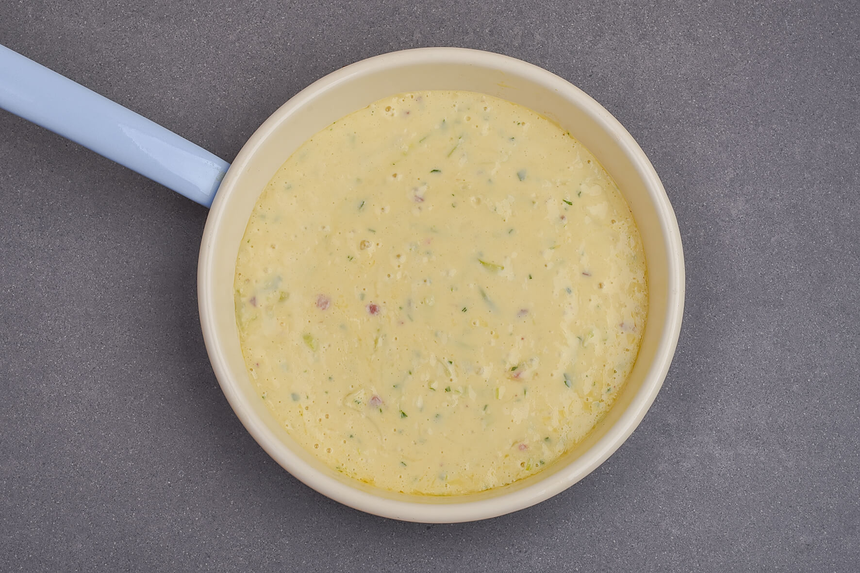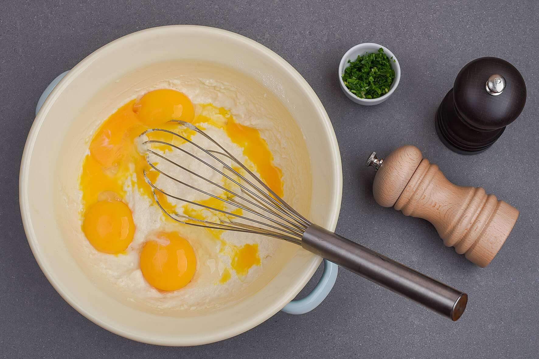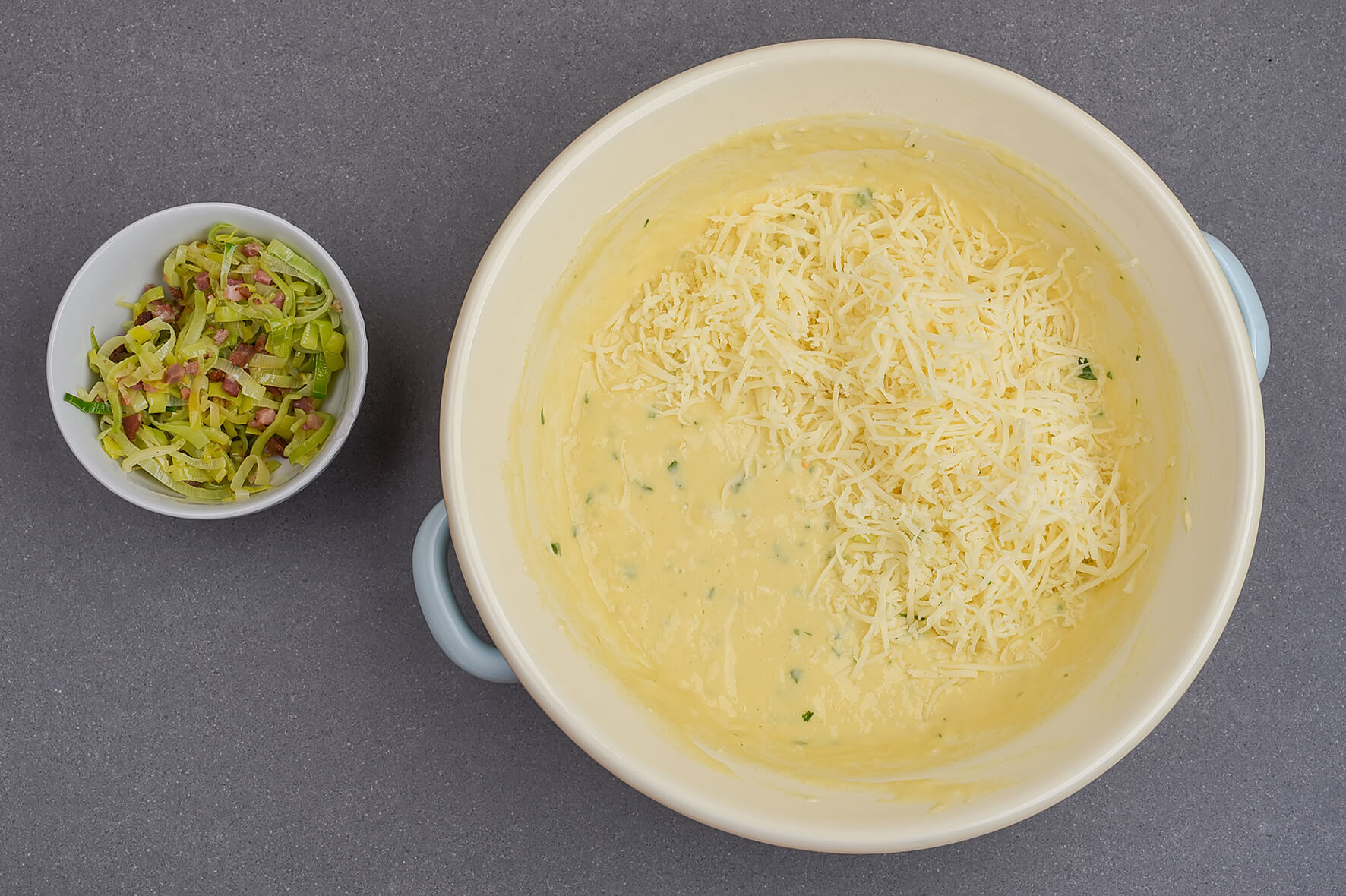 Eier trennen. Eigelbe zur Mehl-Milch-Mischung geben, salzen und pfeffern. Mit fein gehackter Petersilie verfeinern. Geriebenen Käse und die Hälfte der Speck-Lauch-Mischung dazugeben. Zum Schluss den festen Eischnee unterheben.