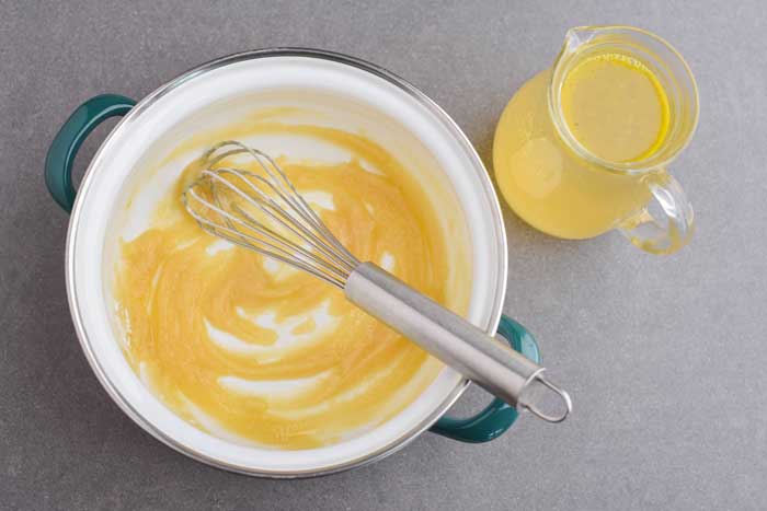 Die Butter in einem Topf schmelzen lassen, das Mehl dazugeben und unter Rühren anschwitzen. Die Gemüsebrühe nach und nach unter Rühren dazu gießen und köcheln lassen, bis die Suppe leicht eindickt (ca. 7 bis 10 Minuten).
