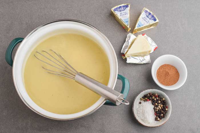 Die Käseecken unterrühren und schmelzen lassen. Mit gehackten Kräutern, Salz, Pfeffer und Muskatnuss abschmecken.