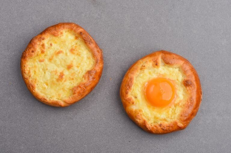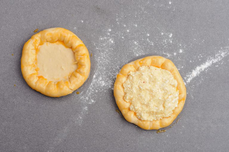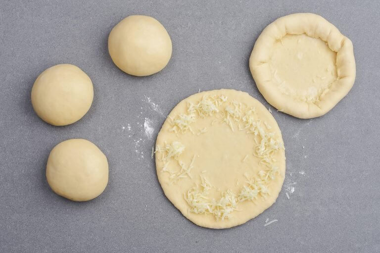 Den Teig in 10 Teile teilen. Jedes Stück zu einer Kugel formen und zu einem Kreis ausrollen (ca. 15-16 cm Durchmesser). Den restlichen geriebenen Käse am Rand rundherum verteilen, den Teig über den Käse nach innen klappen und etwas festdrücken.