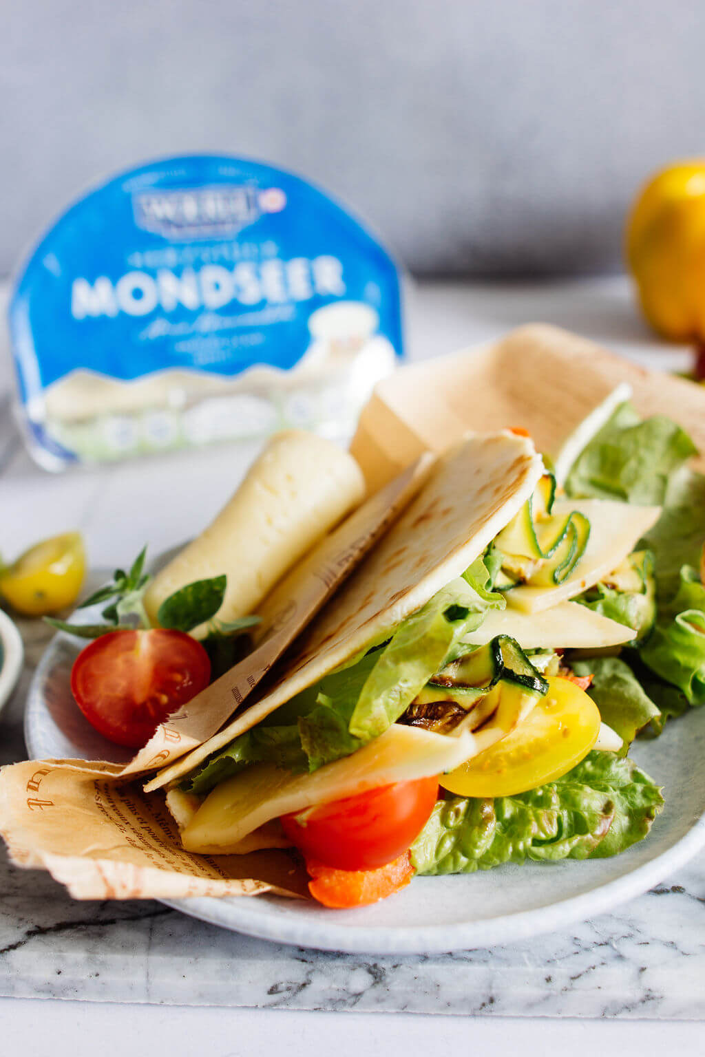 Die eine Hälfte mit Frischkäse bestreichen, mit Scheiben des Herzstück Mondseer belegen und nach Herzenslust mit Gemüse ergänzen.