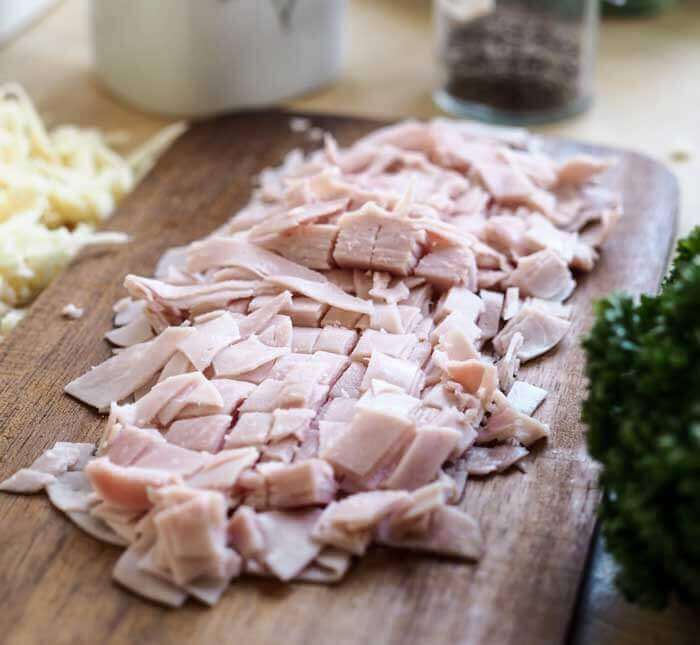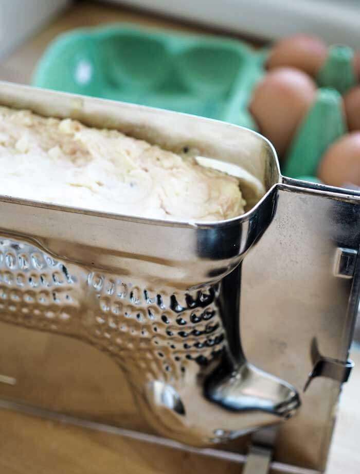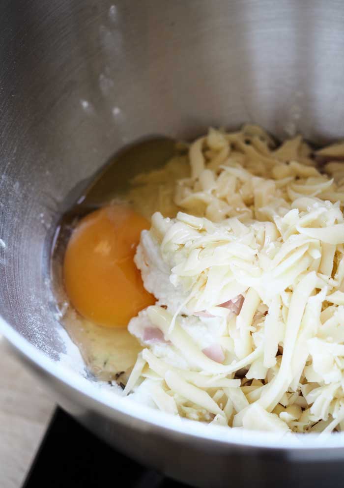 Eine Osterlammform ausfetten und bemehlen, den Ofen auf 180°C vorheizen. Schinken, Käse, Öl, Topfen, Mehl, Ei, Kümmel und Salz mit dem Knethaken der Küchenmaschine oder des Handrührgeräts zu einem glatten Teig verkneten.