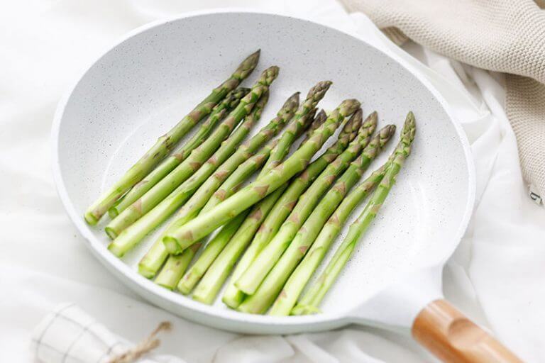 Den Spargel putzen, die Enden 1 cm lang abschneiden. Die Spargelstangen in einer Pfanne mit etwas Olivenöl 5-7 Minuten lang braten, dabei immer wieder durchschwenken. Vom Herd nehmen und komplett abkühlen lassen. Den Spargel leicht salzen.