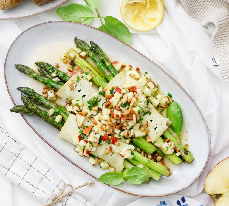 Spargel-Mondseer-Röllchen mit Apfelvinaigrette und Pinienkernen