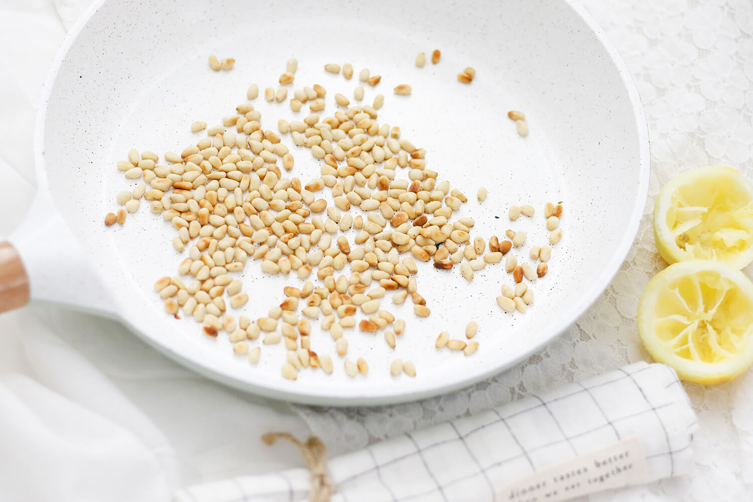Für das Pesto die Pinienkerne in einer Pfanne ohne Fett goldbraun rösten.